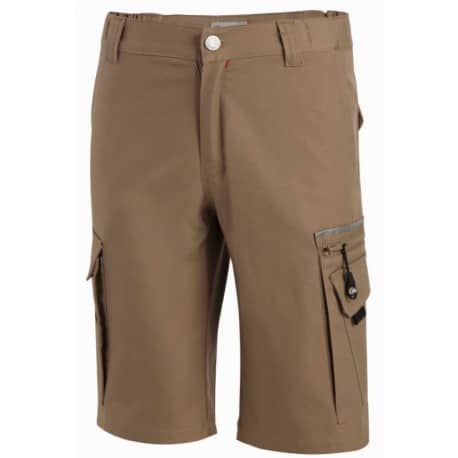 Bermuda à ceinture élastiquée aux côtés, 5 passants. Poches italiennes. Poche cuisse droite fermée par rabat avec poche compartimentée. Poche cuisse gauche fermée par zip, passepoils rétroréfléchissants. Poche téléphone.
